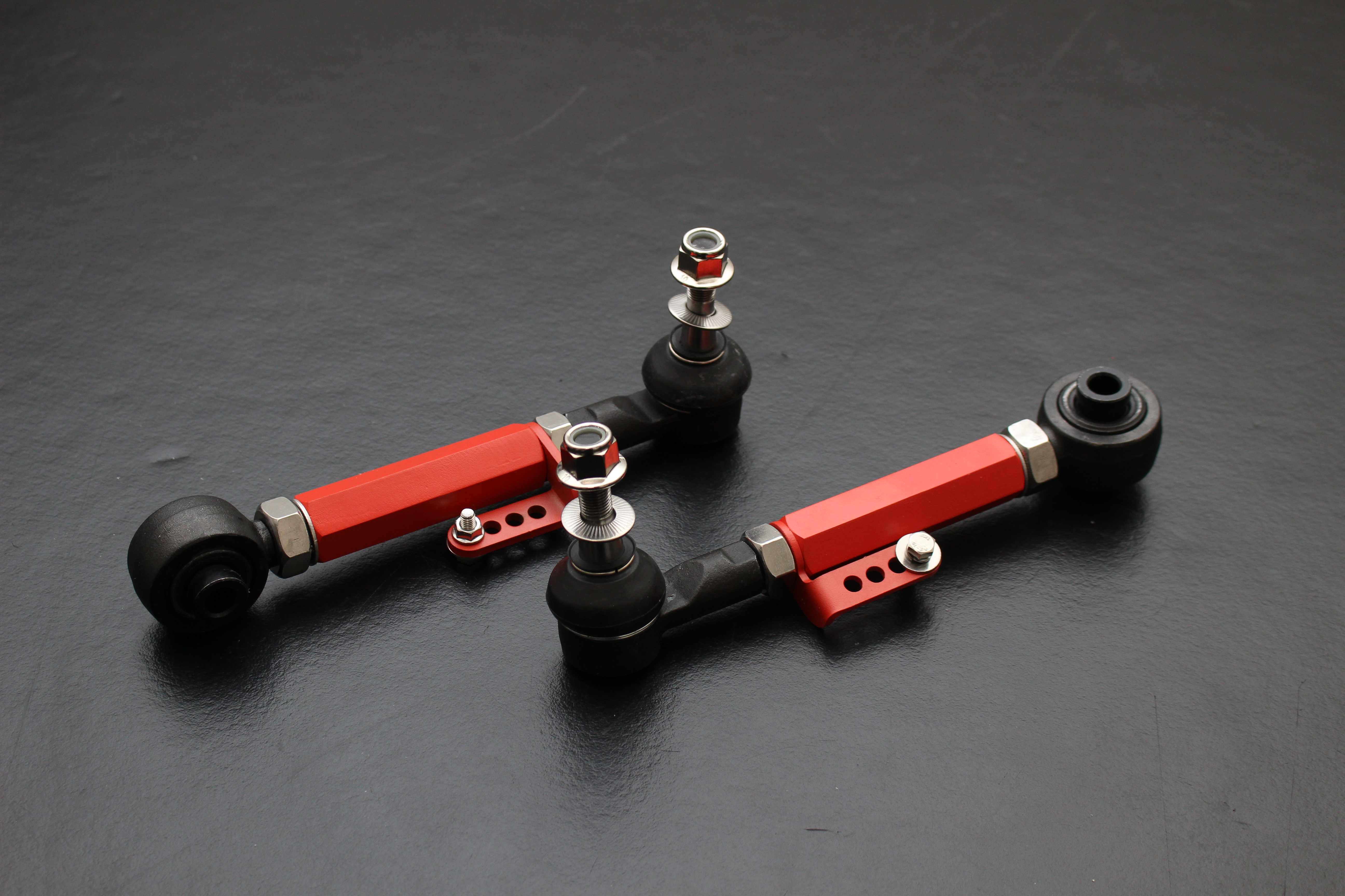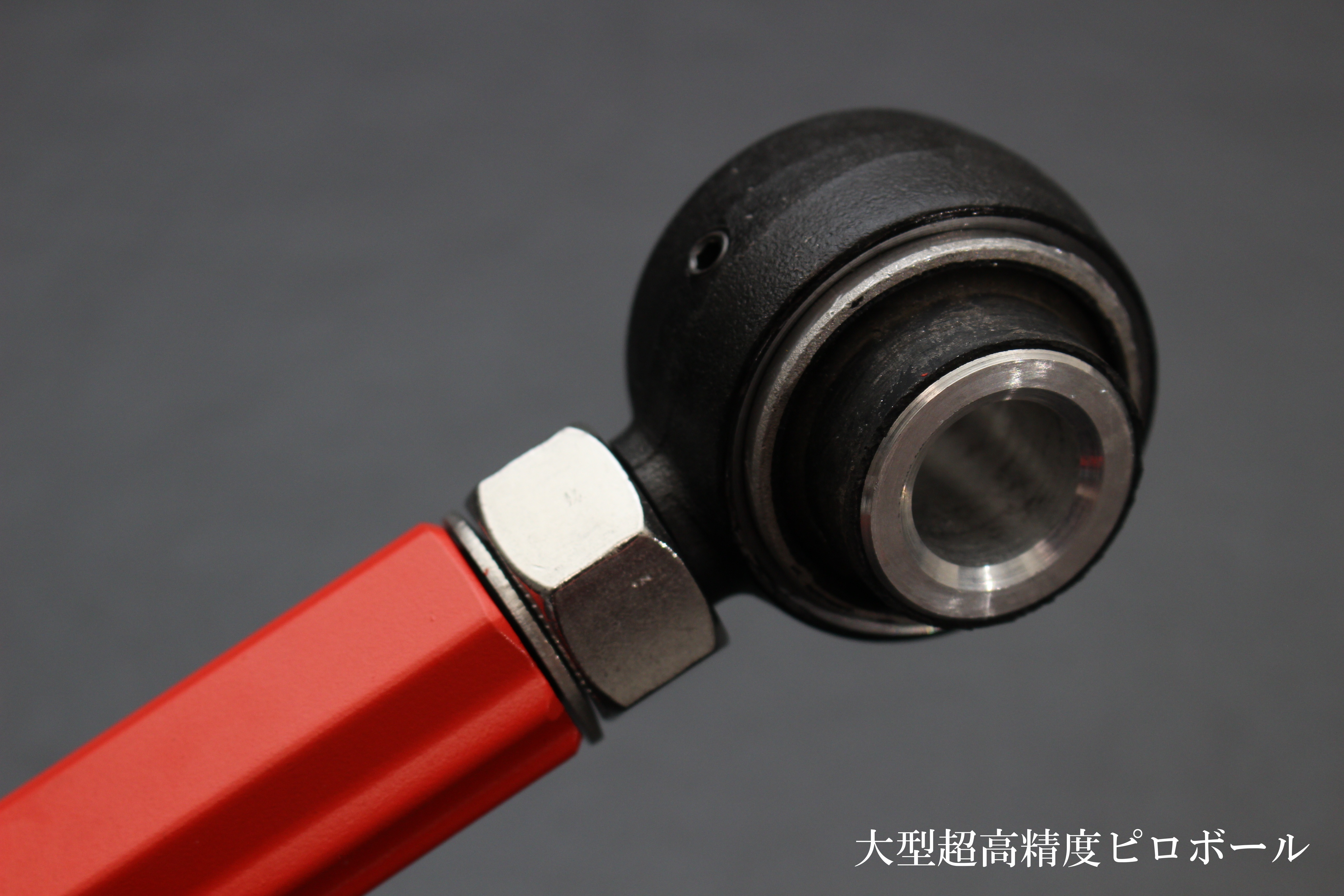 「高強度」「軽量化」「調整域」に徹底して拘りました。製品の心臓部とも言える「ピロボール」は、通常のピロボールよりも大口径化し、軸部やギヤなど、主に高負荷がかかる可動部品に使用される「45号鋼(JISS45C)」中炭素鋼を採用!合わせ側のハウジング部にはSPCC(ColdRolledCarbonSteelSheet)=「低炭素冷間圧延鋼板」を用いることで、高次元での靭性構造と耐久性のある、超高精度ピロボール※1が完成!大きく滑らかに可動し、正確でダイレクトな路面フィードバックを実現!本体には「6061-T6アルミ合金」を採用し、軽量かつ高強度を両立しました。スチール製アームに比べてバネ下重量を軽減し、サスペンションの応答性を高めるとともに、振動の伝達を抑制します。ナックル側の接合部は3次元の補強板を用いたことで、各段に剛性を上げました。※2またアルミ合金はサビにも強く高寿命!