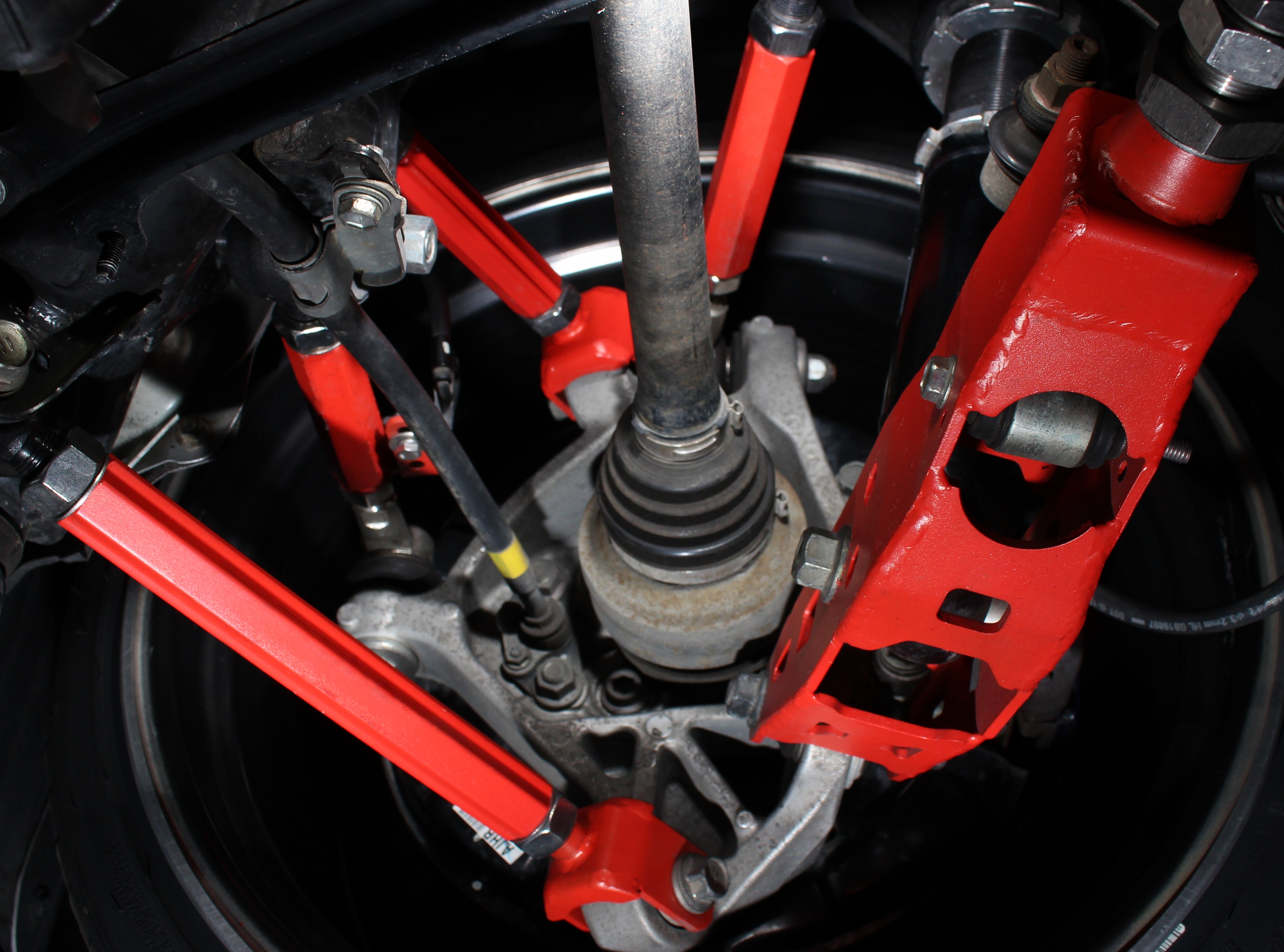 脚回りのショックアブソーバーやアーム類は、メンバーやナックルへの接続部分のほとんどがゴムブッシュ製ですので、横Gやトラクションが掛るとゴムブッシュが伸び縮みし、衝撃を吸収して、乗り心地を良くする構造になっています。しかし「アグレッシブに走る」となるとこのゴムブッシュの衝撃吸収がかえって挙動の妨げになり、車両自体が機敏な動きをしづらくなります。車高調をはじめ、アーム類などの脚回りをゴムブッシュタイプからピロボール式に変え、強化することで車両が余計な動きをせず、挙動をダイレクトに感じることができ、機敏なステアリングワークか可能となり、車両を変幻自在に操ることが可能になるのです。また、アーム自体が調整が可能になれば、ホイールを様々な位置に任意に変えることができ、ドレスアップ効果としても効果を発揮できます。