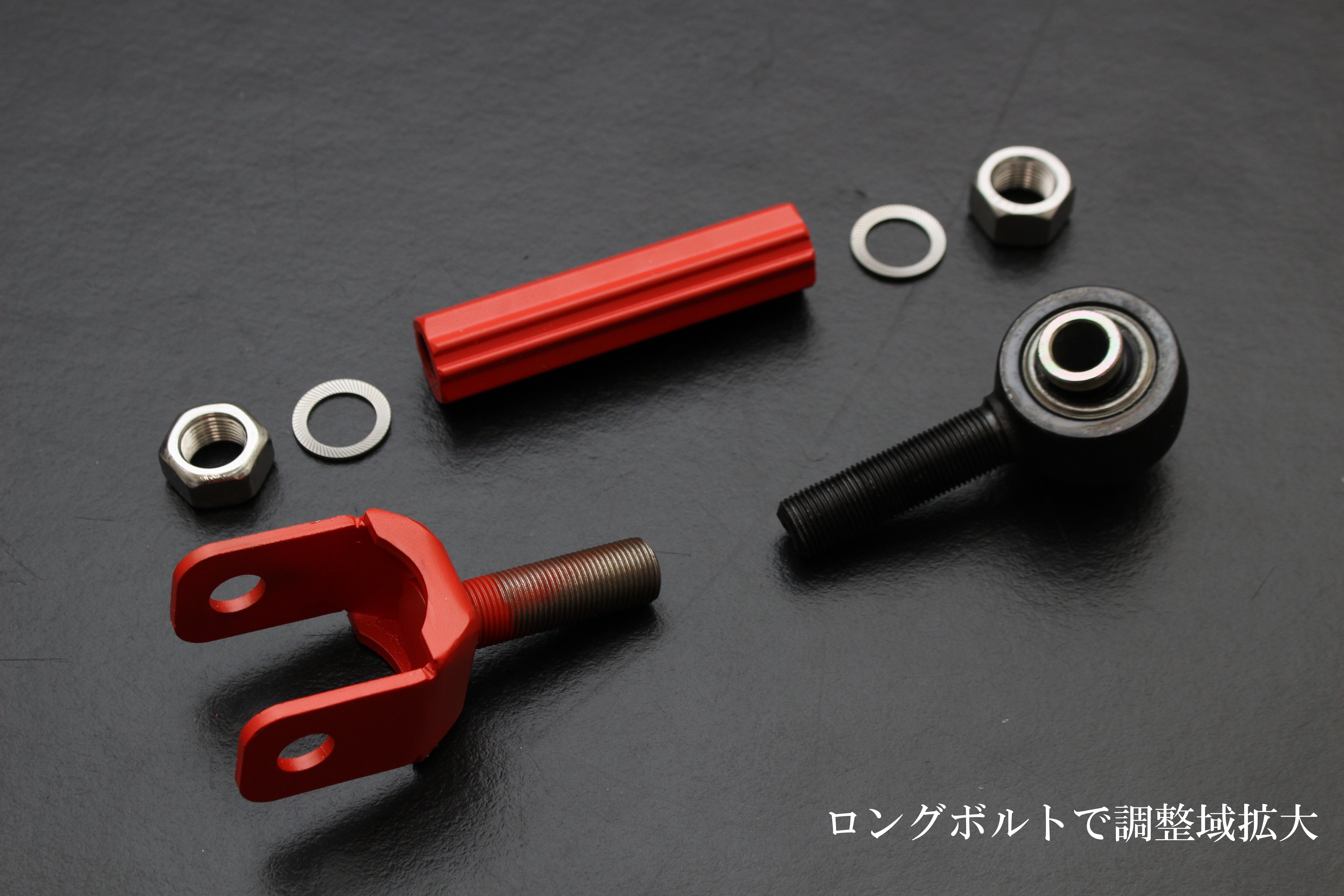 【強靭アーム】はターンバックル調整式ですので、車両に装着したままナットを回すだけでアーム全体の長さを調整でき、キャンバー角やトー角などを高精度に調整することが可能です。独自のロングボルト設計※3により、調整幅を大幅に増大。この構造により、設定範囲が拡大し、走行バリエーションが増えます。また、経年劣化などによりアライメントがずれ、タイヤが偏摩耗することがありますが、それもこの【強靭アーム】を使用することで適正値に補正でき、接地面を均等化、タイヤ寿命を延ばせ、直進安定性が上がります。