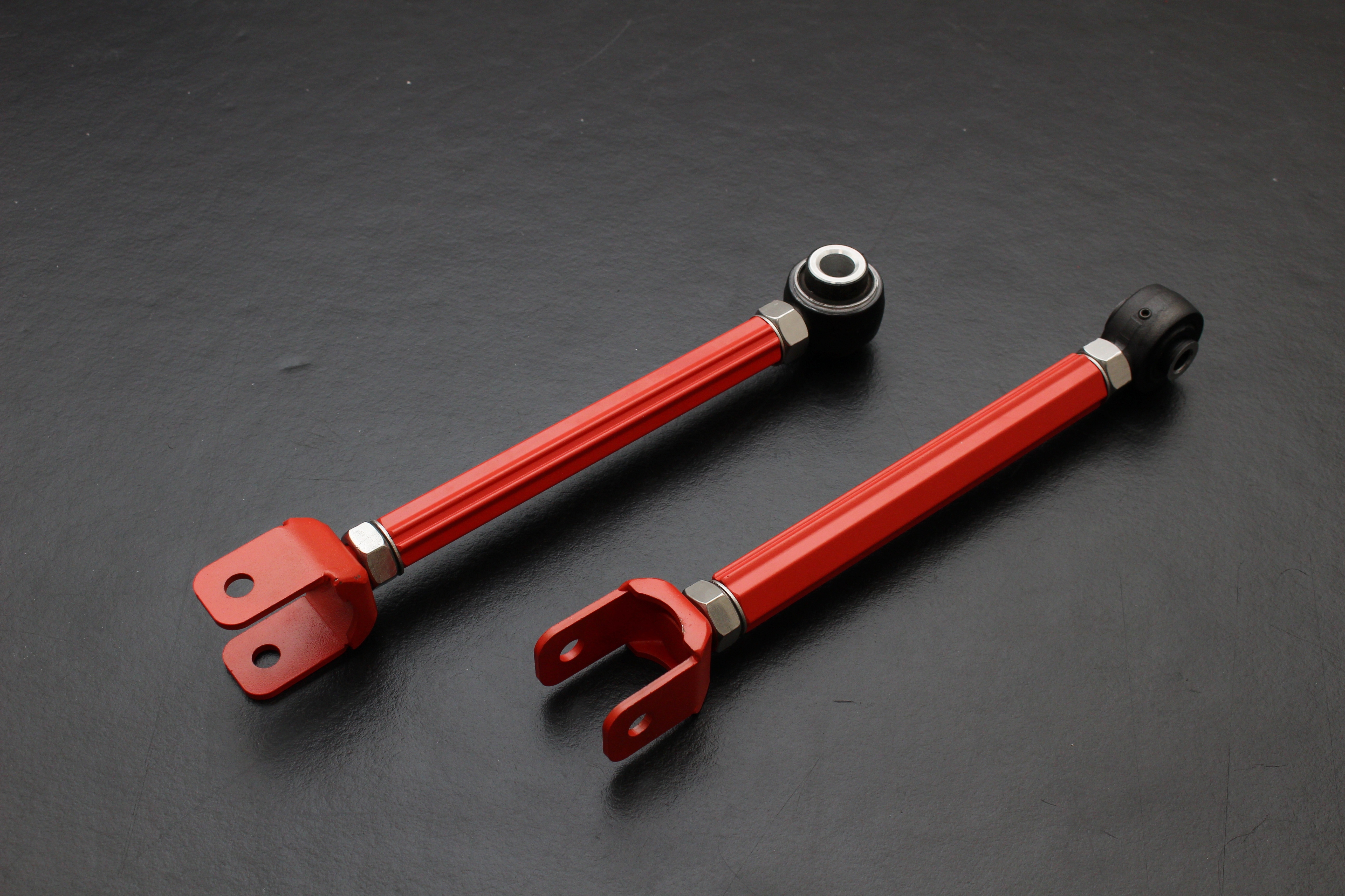 車高調やローダウンスプリングなどで車高を下げると、純正の適正値が崩れ、「ハの字」(ネガティブキャンバー)状態になりやすく、直進安定性やコーナリング性能が低下します。【強靭アーム】を装着することで、ホイール角度を最適化し、グリップ力・コーナリングの安定性・ステアリングの応答性が大幅に向上します。サーキット走行やワインディングでは好みの設定値にセットすることができるので、最高のパフォーマンスを発揮することが可能になります。また、サスペンション自体の交換の必要がなく、コストパフォーマンスにも優れています。